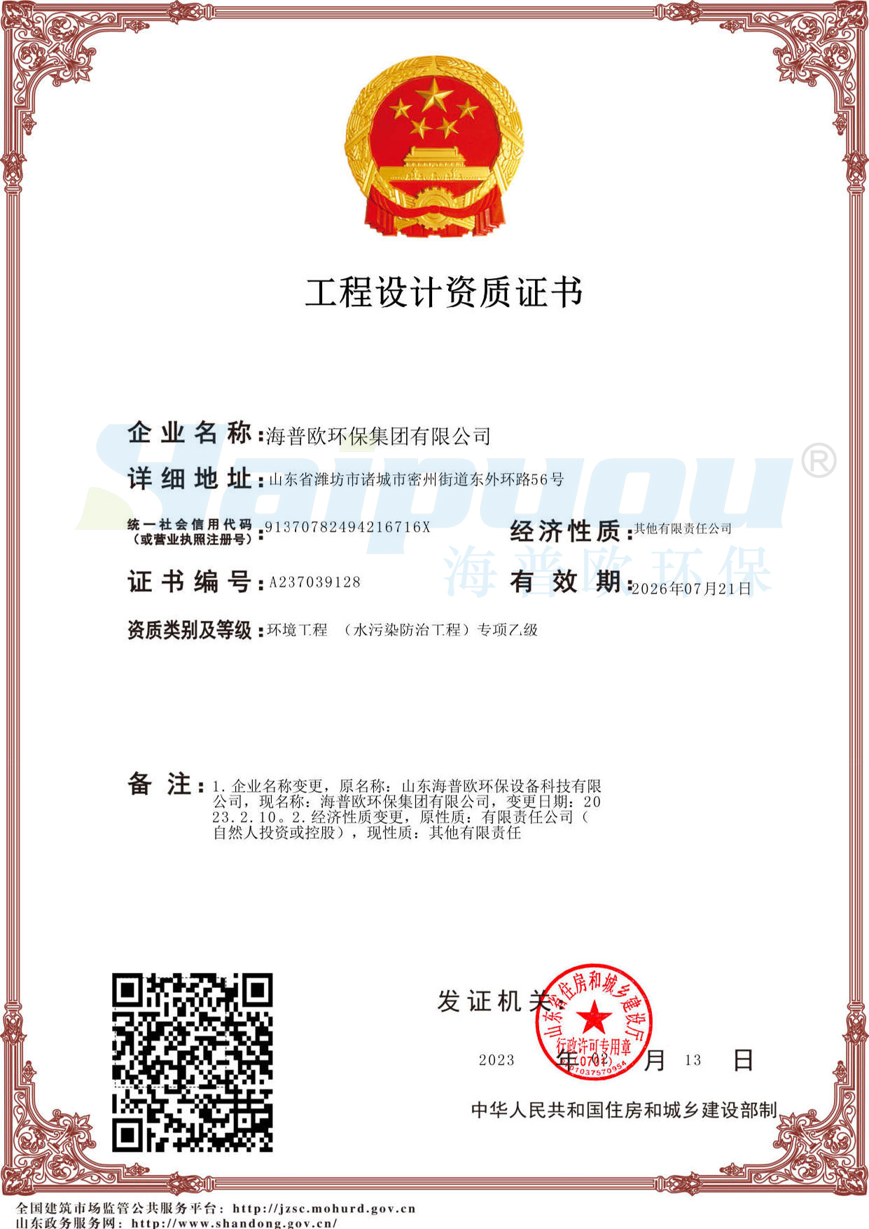 海普歐環(huán)保集團(tuán)有限公司企業(yè)簡介 海普歐環(huán)保集團(tuán)是國家高新技術(shù)企業(yè)、國家級專精特新“小巨人”企業(yè)、工信部環(huán)保裝備制造行業(yè)規(guī)范條件企業(yè)、山東省專精特新企業(yè)、山東省制造業(yè)單項(xiàng)冠軍企業(yè)、山東省“瞪羚企業(yè)”、山東省兩化融合優(yōu)秀企業(yè)、山東省技術(shù)創(chuàng)新示范單位、山東省環(huán)境保護(hù)產(chǎn)業(yè)“骨干企業(yè)”、山東省DCMM貫標(biāo)試點(diǎn)單位、服務(wù)型制造示范企業(yè)、“隱形冠軍”企業(yè),擁有山東省工業(yè)設(shè)計(jì)中心、山東省一企一技術(shù)研發(fā)中心、山東省博士后創(chuàng)新實(shí)踐基地、濰坊市企業(yè)技術(shù)中心、濰坊市面源污染治理及綜合利用裝備重點(diǎn)實(shí)驗(yàn)室。公司擁有環(huán)境...