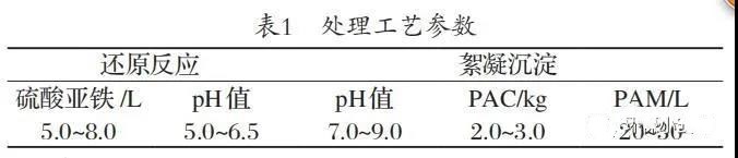 硫酸亞鐵作為還原反應(yīng)的還原劑,可以將六價(jià)鉻離子還原反應(yīng)的酸堿度調(diào)整到6.5以下。此時(shí),不需要調(diào)整酸堿度就可以完成處理,減少了酸堿的使用。此外,還原劑反應(yīng)產(chǎn)生氫氧化鐵后,還可以實(shí)現(xiàn)絮凝,減少絮凝劑的實(shí)際用量,進(jìn)一步降低成本,最終達(dá)到滿足處理質(zhì)量、節(jié)約處理成本的良好效果。處理工藝參數(shù)如表1所示。