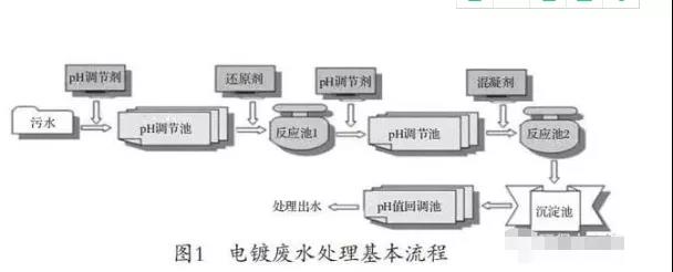 若以銅散熱器為核心,實(shí)際生產(chǎn)制造時(shí),許多黃銅件都要經(jīng)過(guò)化學(xué)除油和酸洗,而且還有許多鋼件要進(jìn)行電鍍加工,加工時(shí)會(huì)產(chǎn)生一定量的電鍍廢水,廢水中,常含有鐵離子、鋅離子、六價(jià)鉻、銅離子等多種有毒有害物質(zhì)。如果不能有效地處理這些廢水而直接排放,就會(huì)造成極其嚴(yán)重的污染,甚至危害水域附近居民的身體健康。為了有效地消除這種污染,減少有害物質(zhì),需要對(duì)其合理、可行的處理工藝和參數(shù)進(jìn)行分析。圖1顯示了電鍍廢水處理的基本工藝。