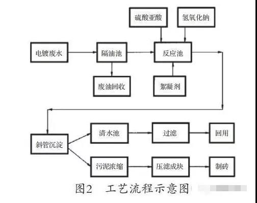 圖2的工藝流程:①油分離器主要具有調(diào)節(jié)、油分離器和儲(chǔ)水三種功能;②向反應(yīng)池中添加的堿是從車間生產(chǎn)的廢堿產(chǎn)生的。通過(guò)合理應(yīng)用這部分廢堿,除了可以將車間生產(chǎn)中使用的水的酸堿度控制在6.5以內(nèi),為直接還原反應(yīng)創(chuàng)造良好的條件,還可以減少新堿的實(shí)際用量,從而真正實(shí)現(xiàn)廢物處理的基本目標(biāo)。