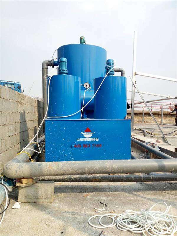 溶氣水從池底進入,污水從上流到分離罩內,兩種物質充分混合,溶氣水在釋放器形體上形成了大量的細小氣泡,在氣泡的粘著下,其所形成的比重小于水中的團塊,迅速浮出水面,形成浮渣,經過撇渣裝置刮去,流進渣槽,排出池外。