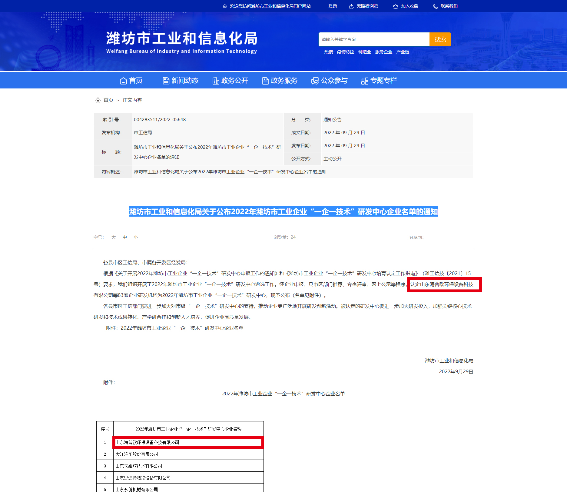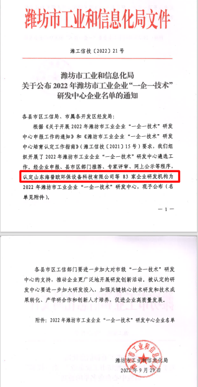 根據《關于開展2022年濰坊市工業企業“一企一技術”研發中心申報工作的通知》和《濰坊市工業企業“一企一技術”研發中心培育認定工作指南》(濰工信技〔2021〕15號)要求,我們組織開展了2022年濰坊市工業企業“一企一技術”研發中心遴選工作。經企業申報、縣市區部門推薦、專家評審、網上公示等程序,認定山東海普歐環保設備科技有限公司等83家企業研發機構為2022年濰坊市工業企業“一企一技術”研發中心,現予公布(名單見附件)。