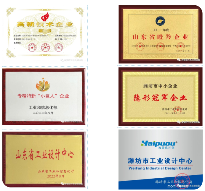 創新,對于一個企業的重要性不言而喻,尤其是技術上的創新能力。近年來,山東海普歐環保一直努力加強產學研聯合,并逐步構建科研開發知識體系,這使“創新”成為海普歐環保引領行業發展的代名詞。自海普歐環保技術研發中心成立以來,即設有專門的研發中心領導小組,技術委員會、專家委員會,同時確立了研發中心職責。在海普歐人的不斷探索和努力下,公司榮譽不斷增加,先后獲得了國家高新技術企業、工信部專精特新“小巨人”企業、山東省“瞪羚企業”、“隱形冠軍”企業,擁有山東省工業設計中心、濰坊市企業技術中心、濰坊市面源污染治理及綜合利用裝備重點實驗室。公司擁有環境工程專項設計乙級資質,環保工程專業承包資質壹級、市政公用工程施工總承包叁級、建筑機電安裝工程專業承包叁級資質、施工勞務不分等級資質、安全生產許可證;同時取得了水污染治理設施運維能力評價二級;中國環保產業聯合會理事單位、山東省環保產業協會理事單位、寧夏山東企業商會執行會長單位、河南省山東商會常務副會長單位、諸城市環保產業聯盟理事單位;并通過了ISO9001質量體系認證、ISO14001環境管理體系認證、ISO45001職業健康安全管理體系認證;擁有發明型專利20項,實用性專利86項、計算機軟件著作權2項;注冊了“haipuou”品牌商標;公司榮獲“濰坊市科學技術獎”“全國誠信經營示范單位”、“守合同重信用企業”、“AAA信用企業”、“中國優秀環保企業”、“文明誠信民營企業”等多項榮譽;我公司產品被評為“用戶評選最滿意品牌”。