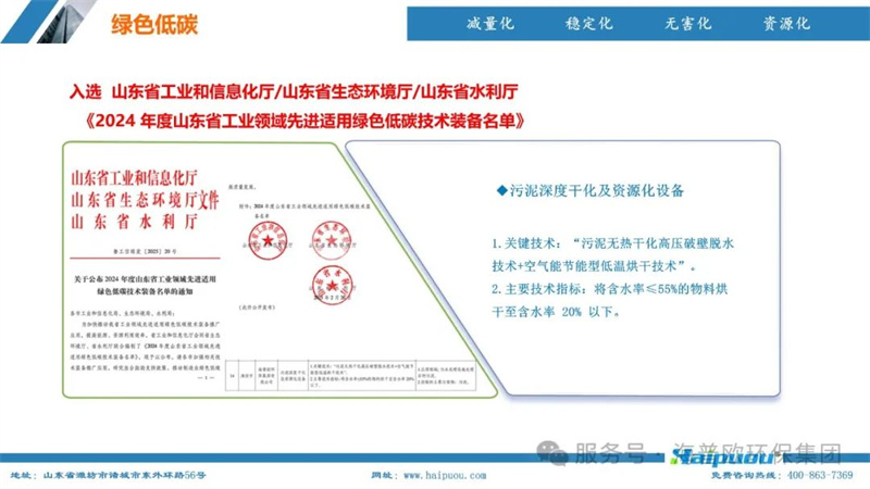 海普歐環(huán)保在污泥處理領(lǐng)域擁有10項(xiàng)發(fā)明專利,其“污泥資源化利用關(guān)鍵技術(shù)研發(fā)及產(chǎn)業(yè)化”項(xiàng)目更是榮獲山東省企業(yè)科技創(chuàng)新協(xié)會科技創(chuàng)新獎優(yōu)秀項(xiàng)目二等獎。集團(tuán)憑借其在環(huán)保領(lǐng)域的突出貢獻(xiàn)和技術(shù)創(chuàng)新,成功入選山東省工業(yè)和信息化廳、山東省生態(tài)環(huán)境廳、山東省水利廳聯(lián)合發(fā)布的《2024年度山東省工業(yè)領(lǐng)域先進(jìn)適用綠色低碳技術(shù)裝備名單》