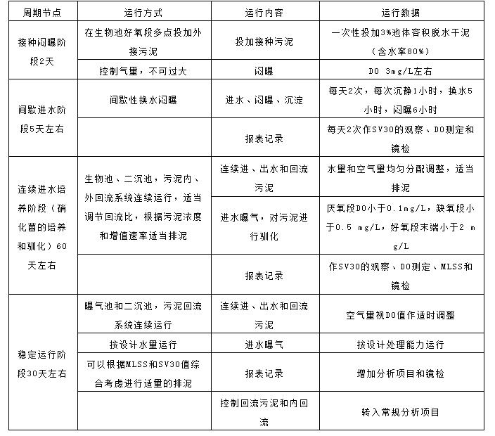 污泥接種期間,每天間歇進水4次,為污泥提供養分,增加繁殖;同時減少甚至不排泥。污泥培養馴化的具體周期安排見下表: