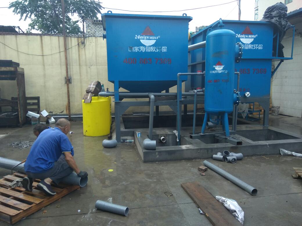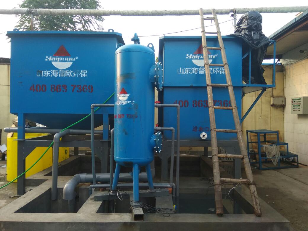 調節池的出水由泵提升到氣浮池,配備自動加藥系統。污水加入氣浮池,自動加藥系統同時將混凝劑隨水流加入氣浮池,在水流和氣體的共同作用下,混凝劑與污水充分混合。通過凝集劑的壓縮雙電層和電荷的中和作用、吸附架橋的作用和絮凝網的捕獲作用,將污水中小粒子的懸浮物和膠體凝聚成大粒子。溶解在污水中的氣體浮起的過程中,將水中的這些凝聚粒子夾在水面上,溢出去除。氣浮池的出水依次進入生物池進行生物處理,去除大部分有機物、氨氮等物質,用二沉池的泥水分離,通過過過濾作用進一步去除污水中的雜質,使污水更加凈化。