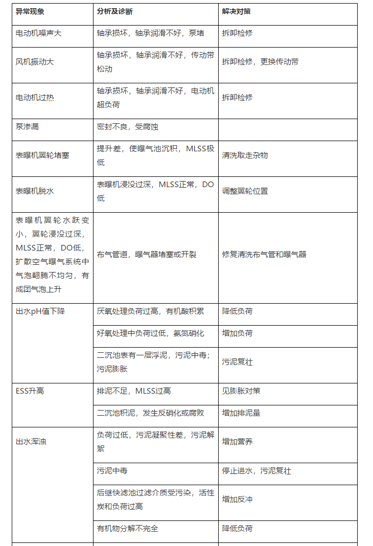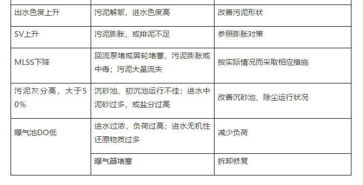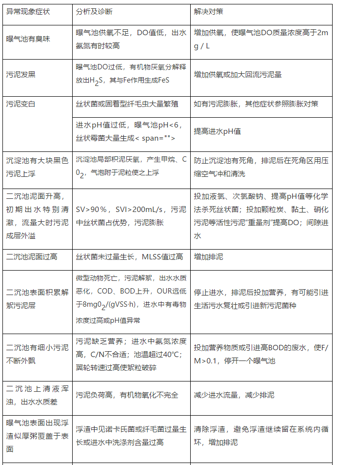 綜上所述,污泥膨脹時,應及時改變曝氣池中微生物所處的環(huán)境條件。在兩種微生物——菌團細菌和絲狀菌共存競爭的污泥系統(tǒng)中,創(chuàng)造適合菌團細菌生長的環(huán)境條件,使絲狀菌無法優(yōu)勢生長,從而達到改善污泥沉降壓縮性能、控制或防止污泥膨脹的目的。下表是污泥性質異常及分析。