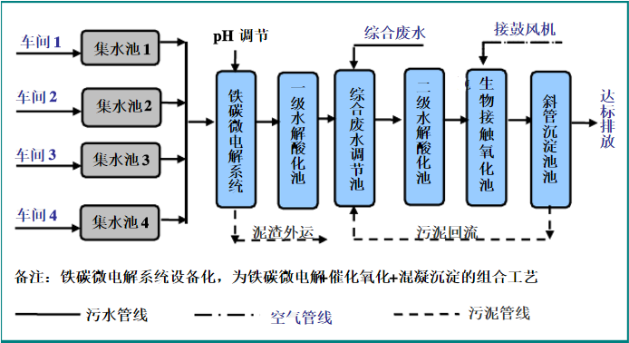 各類生產線的廢水進行單獨收集,之后統一送入初調節池中進行水質的調節;預處理采用“鐵碳微電解+催化氧化+混凝沉淀”工藝,沉淀溢流到一級水解酸化池中,之后流入到綜合調節池中,與生活污水、清潔下水混合后,送入二級水解酸化池,水解后出水至生物接觸氧化池中進行好氧處理,處理后水進入沉淀池中,上清液排放。